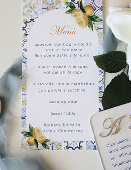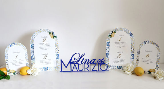Tableau a lastre in plexiglass bianco 3 mm con base a piega (30 cm x 40 cm circa), con dettagli maioliche, nomi tavoli , ospiti e limoni in stampa uv a colori
