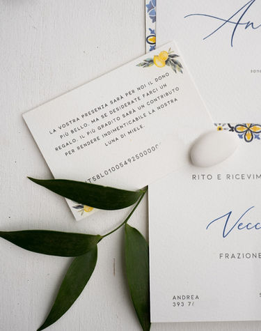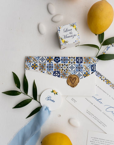 Partecipazione formato portafoglio in cartoncino materico bianco 285 g con finiture esterne maioliche, chiusura con ceralacca.